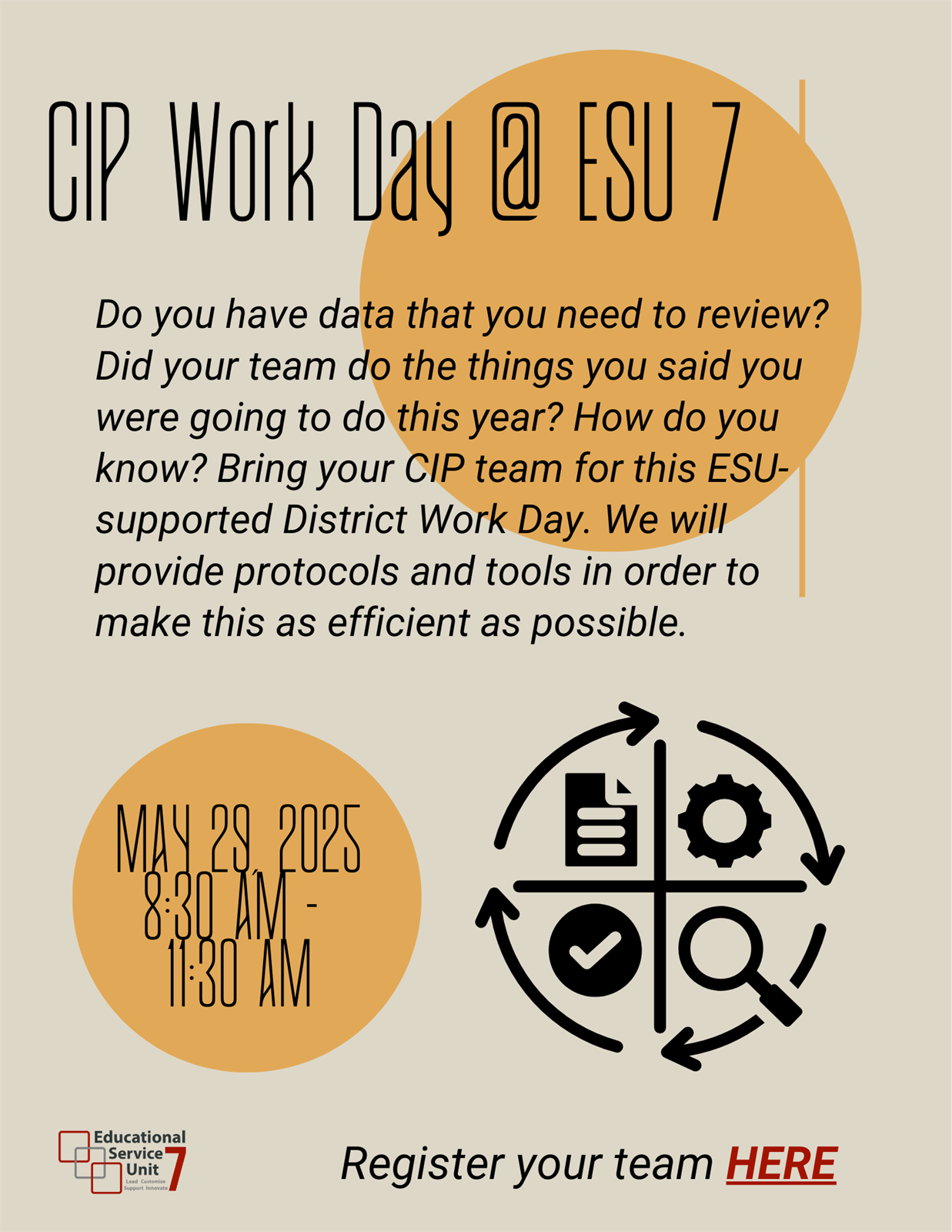 | Description | | Bring your entire CIP team to this work day designed for schools in any year of the CIP cycle, but with special attention to schools preparing for the Year 5 External Visit in the 2026-2027 school year. ESU 7 staff will be available for support. This day will provide flexible work time for your team to make sure you get everything checked off your to-do list.