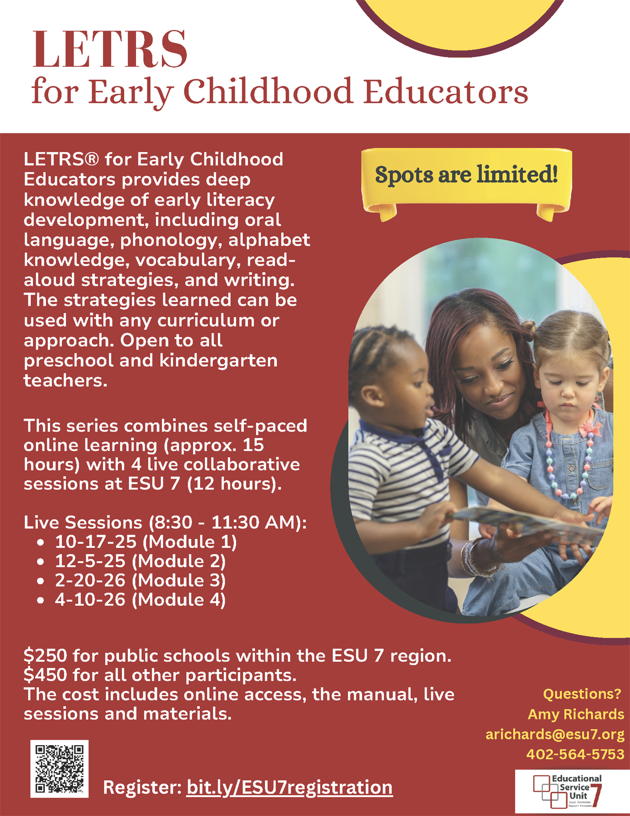 LETRS® for Early Childhood Educators provides deep knowledge of early literacy development, including oral language, phonology, alphabet knowledge, vocabulary, read-aloud strategies, and writing. The strategies learned can be used with any curriculum or approach. Open to all preschool and kindergarten teachers. This series combines self-paced online learning (approx. 15 hours) with 4 live collaborative sessions at ESU 7 (12 hours).
