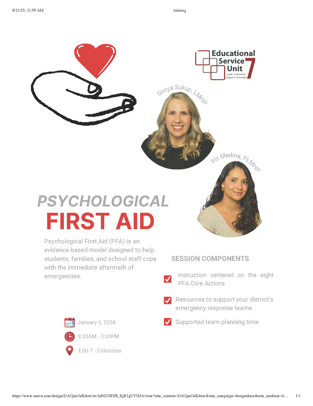 | | 0 | Psychological First Aid for Schools (PFA-S) | 1/9/2026 8:30:00 AM | | ESU 7 Professional Development | Brady | System.Collections.Generic.List`1[odie.workshops.Facilitator] | | 0.00 |  | odie.workshops.Section |